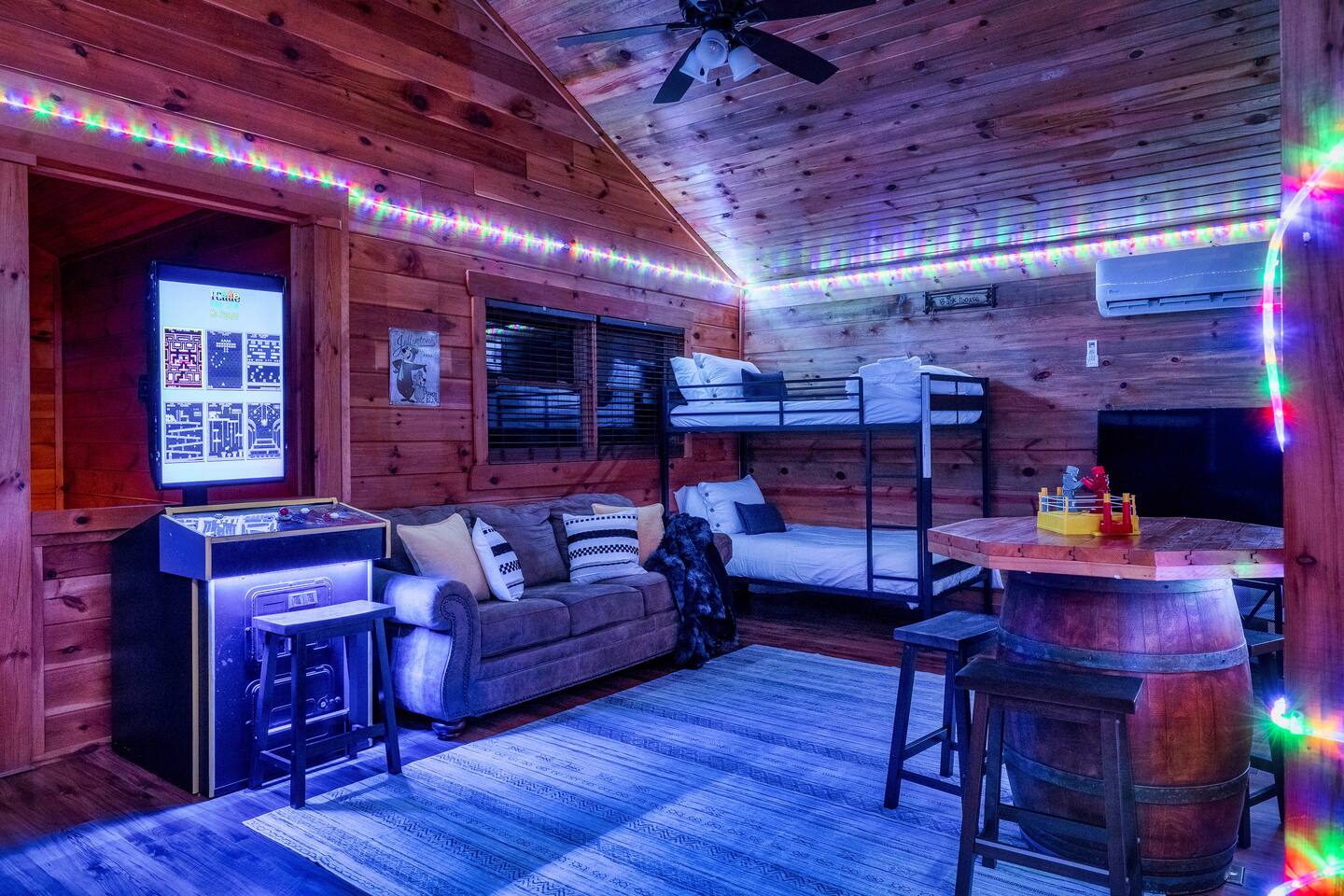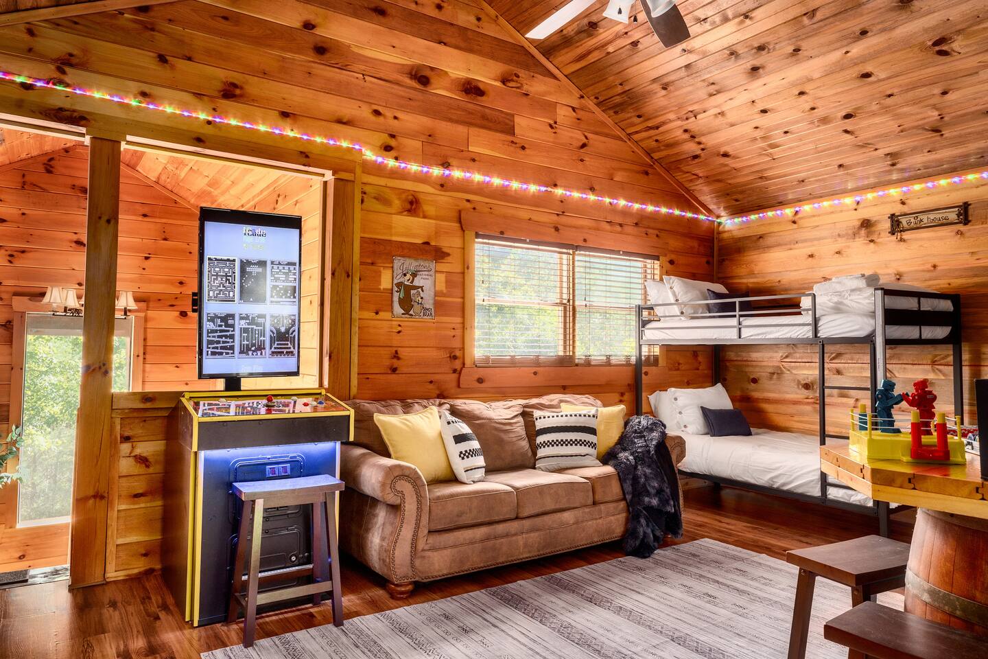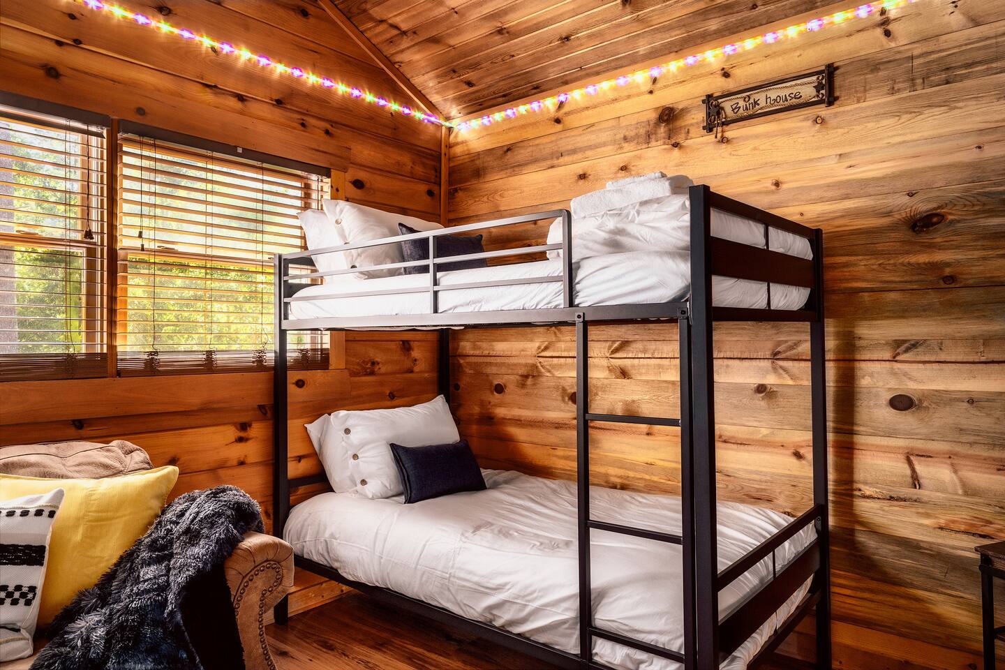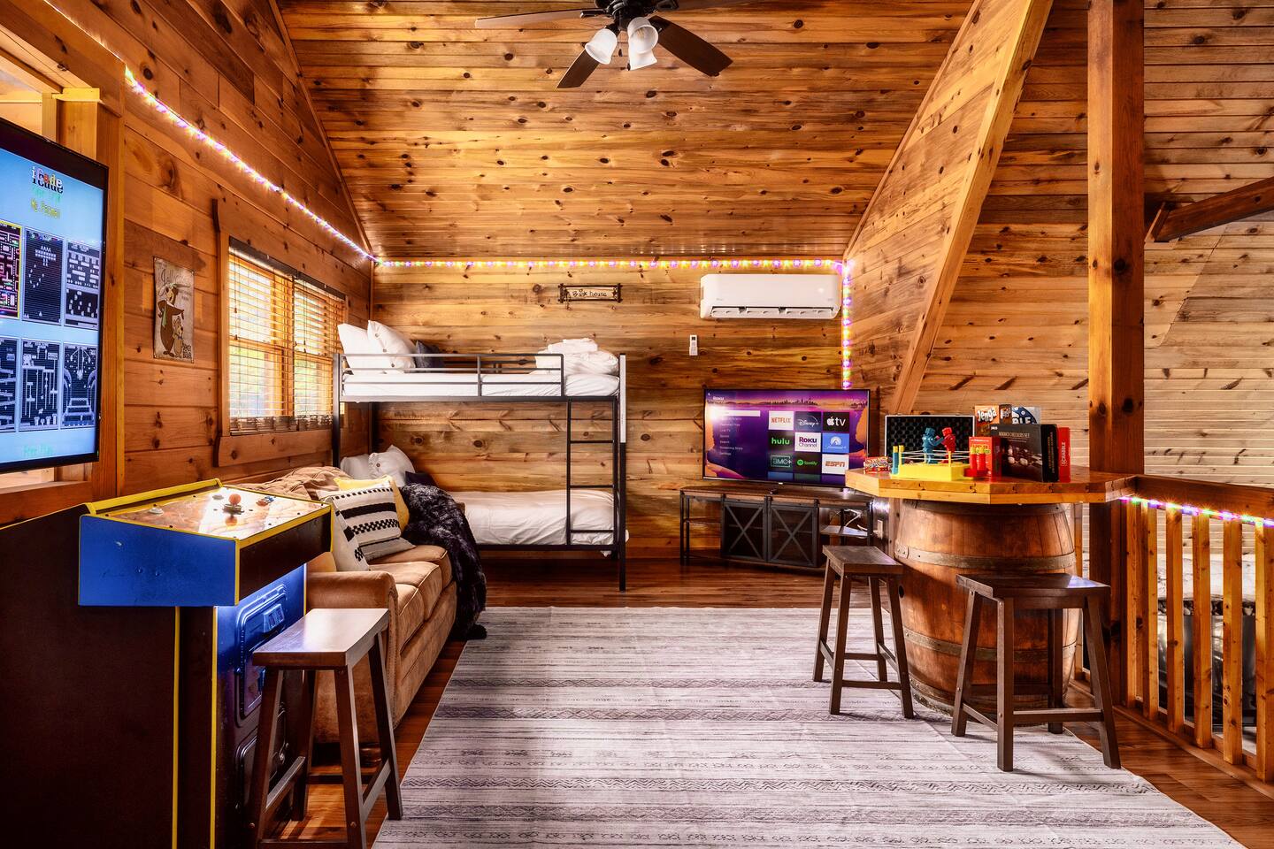 Creekside Cubs Lodge has been fully updated to offer a modern and cozy retreat for all to enjoy. This is the perfect cabin for creating unforgettable memories with family and friends. Book your stay today and enjoy a perfect mountain getaway in the Cedar Falls Resort! 🏝️ Private Indoor Saltwater Pool & Hot Tub Splash, swim, shoot some hoops, or just simply relax in the private indoor pool room. Our pool features a flowing stone creek—a truly one-of-a-kind cabin feature! The pool is saltwater and maintained at 83 degrees to keep everyone comfortable, yet still refreshed! Enjoy Adirondack chair seating, a large Roku TV set in Guest Mode, and ambient lighting to make this room a truly standout feature of the cabin. We provide a few inner tubes, pool noodles, and towels. Off of the pool room, you'll have access to our back porch, where you can enjoy the full-size hot tub for a relaxing soak after a long day exploring the Smokies. The indoor pool room is protected with door and splash alarms to help keep your little ones safe during your stay. 🍴 Fully-Stocked Kitchen and Coffee Bar: The kitchen is located on the main floor just as you enter the cabin and features updated cabinets, full-size appliances, cookware, glassware, plates/bowls, utensils, and basic cooking essentials you'll need to make a home-cooked meal for the entire group. Enjoy seating for 6 at our brand new, modern table, with additional seating for 3 at the bar-height counter. We provide a stocked coffee bar to get your day started. Enjoy your morning brew using our Keurig K-Duo drip and K-cup combo maker. We offer a coffee starter-pack, a few K cups to get you going, sugar, powdered-creamer, flavored syrup, and black tea. 🔥 Cozy Living Room: Gather around the unique stone and timber gas fireplace, the main focal point of the room, while streaming your favorite shows on the brand new 65-inch Roku Smart TV, set to Guest Mode, so you can be automatically logged-out of any app you sign into during your stay. The couch doubles as a pullout Queen sleeper sofa, providing an extra sleeping area for your group. 🛏️ Main Level Bedroom Suite: Located just off of the living room, unwind in the main level King suite, fully equipped with fluffy pillows and blankets, dresser, Roku Smart TV, and access to the full-size bathroom. You'll also have your own private access to the large, partially-covered back porch. The full bathroom on the main level features a large soaking tub, shower stall, and vanity. We provide a starter of toilet paper, towels, hand soap, shampoo, body wash, and a hair dryer. 🛏️ Second Level Bedroom Suite + Laundry Closet: Upstairs, you'll find an additional King bedroom suite, also equipped with fluffy pillows and blankets, dresser, Roku Smart TV, and access to another full-size bathroom. The full bathroom on the second level also features a large soaking tub, shower stall, and vanity. We provide additional toilet paper, towels, hand soap, shampoo, body wash, and a hair dryer. You'll also have access to the laundry closet, where you'll find a full-size washer/dryer stack, iron, ironing board, drying rack, and a starter of laundry detergent pods and dryer sheets. ↗️ Loft- Bunk Room, & Game Room: The newly updated loft is a fun-filled space for everyone. The loft features a twin bunk and pullout Queen sleeper sofa. Turn on the perimeter rope lighting to create your very own arcade and game room. The loft features a multi-game arcade console, wall-mounted basketball hoop, board game table, and large Roku Smart TV. Enjoy a variety of board games for the family, poker chips, and playing cards. 🌟 Relaxing Back Porch: The main level porch is partially covered and features outdoor seating under glowing string lights to relax after a long day exploring the Smokies. Enjoy a private, wooded back-drop, with seasonal views of the ridge-line in the winter months. 📶 High-Speed Internet: Stay connected with reliable Xfinity Wi-Fi throughout the cabin. All Roku TVs are set in guest mode, so you will be automatically logged out of any of your streaming services used on the day you checkout. Please note that we do not provide cable. ⛰️ Cedar Falls Resort During your stay you'll have access to amenities provided by Cedar Falls Resort. Enjoy your drive into the resort under the covered bridge, and you'll arrive to our cabin after a short drive. While here, you can enjoy the outdoor community pool (during summer months), playground, basketball court, catch and release fishing pond, and awesome walking trail! For large groups, the pavilion is available for use, unless reserved by a private party. The chapel is available to rent directly through Cedar Falls, which can be reserved and paid for in advance directly through the community website. Please note- we cannot guarantee availability of resort amenities at the time of your stay, as they are operated solely by the resort. ⭐ KEY FEATURES⭐ - 2,889 sq. ft. cabin in the peaceful Cedar Falls Resort - Recently updated interior offering a cozy, modern cabin feel - 2 king bedrooms, sleeping loft + 2 sleeper sofas (sleeps up to 8) - 2 full bathrooms, 1 half bathroom - PRIVATE, indoor saltwater pool (83 deg) with flowing stone creek - Hot tub on porch off of the indoor pool room - Loft game room with arcade, board games, wall-mounted basketball hoop - Multiple Roku Smart TVs set to Guest Mode so you can log-in to your favorite streaming services - Dining table seats 6, bar counter seats 3 - Fully stocked kitchen with cookware, utensils, and basic cooking supplies - Coffee bar stocked with starter coffee pack and starter K-cups, sugar, tea We provide starter kitchen supplies of salt, pepper, various spices, cooking oil, hand soap, dish soap, sponge, dishwasher pods, K-cups, coffee pack, tea, sugar, powdered creamer, and 1 full paper towel roll. Bathrooms are stocked with towels, 2 toilet paper rolls per bathroom, hand soap, shampoo, and body wash. Laundry area inc