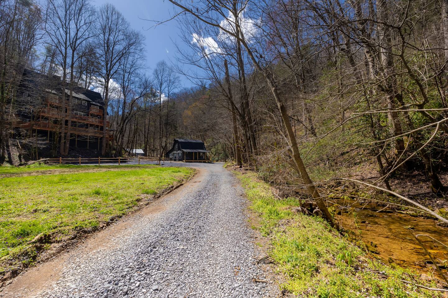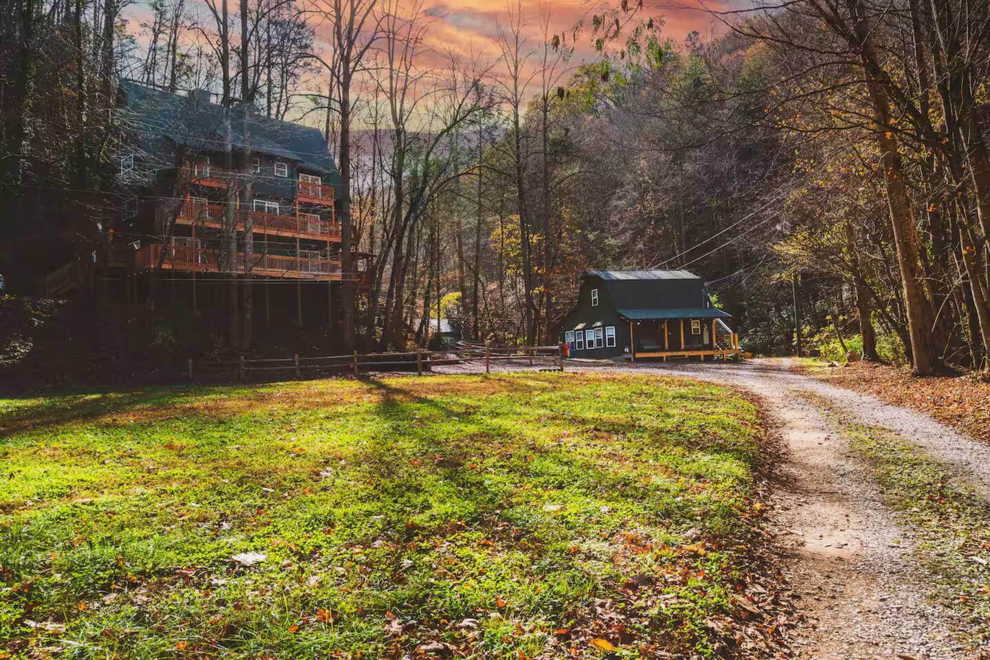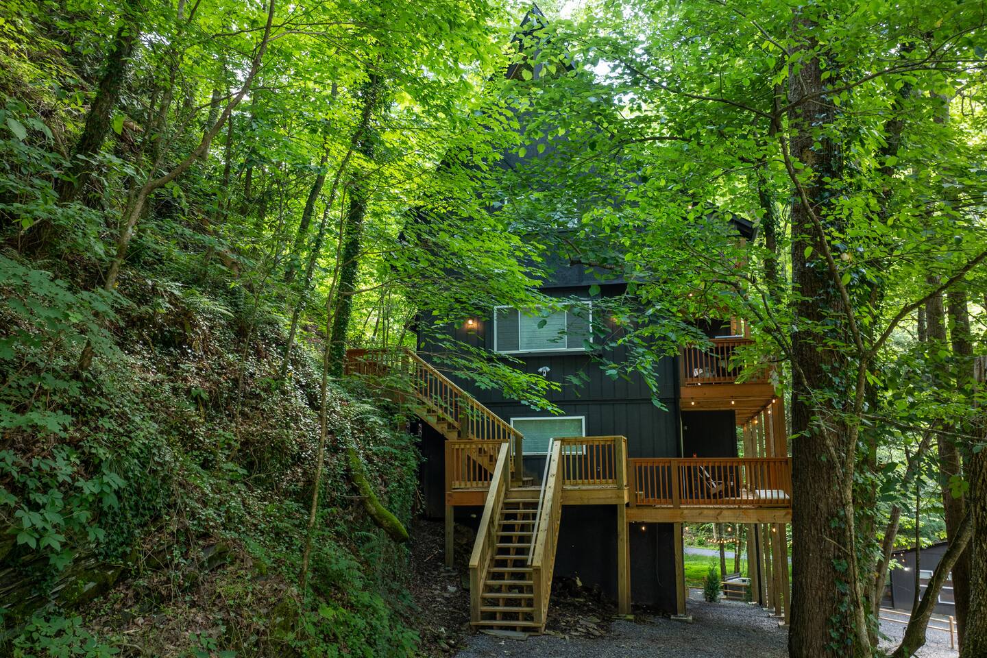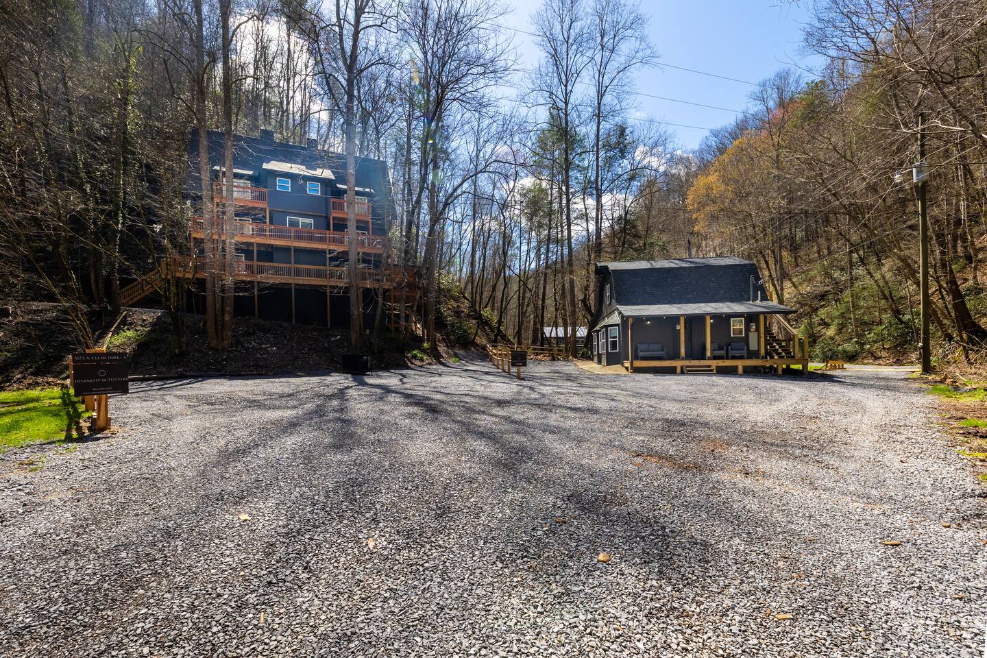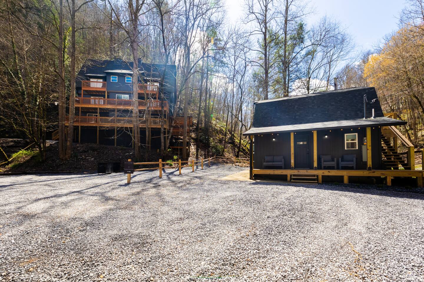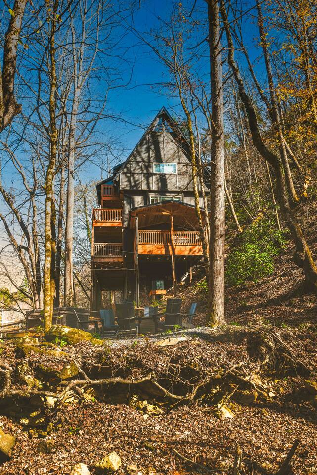 Stony Creek Escape is a stunning 6-acre Estate, featuring 2 properties that can accommodate up to 25 guests, making it ideal for family gatherings, group retreats, weddings, and a luxurious escape to the Great Smoky Mountains! The Estate is located in the tranquil Shagbark Resort and features the 4-bedroom Lodge and the 2-bedroom Bungalow. This thoughtfully designed property offers the perfect blend of premium amenities, comfort, and functionality. Pet friendly for up to 3 pets!! Book your stay today and enjoy a perfect mountain getaway in Shagbark Resort! π΄ Fully-Stocked Kitchen + Dining: The Lodge and Bungalow each feature their own fully stocked kitchen, complete with full-size appliances, cookware, glassware, plates/bowls, utensils, and basic cooking essentials you'll need to make a home-cooked meal for the entire group. Enjoy your morning brew using our Keurig drip and K-cup dual coffee pots. We offer a coffee starter-pack at each property to get you going. Bring extra if you are coffee lovers! In the Lodge, you'll step foot into the large dining area as you first enter the home. Our large, rustic dining table comfortably fits 10, with additional bar-height seating available in the nook and kitchen. Take in the ambiance provided by the electric fireplace mounted to the wall. A large Roku Smart TV means you'll never miss a big play as you cheer on your favorite team or catch up on some shows. The Bungalow is equipped with a cozy dining area, just off of the kitchen, that seats 6 guests. π₯ Cozy Living Rooms: Whether in the Lodge or Bungalow, gather with your loved ones- playing games, or watching your favorite shows in the thoughtfully designed living rooms. Each living room features a large Roku Smart TV, set to Guest Mode, so you can stream on your favorite apps throughout your stay and be automatically logged-out on the day you depart. Both the Lodge and Bungalow feature a sleeper sofa, providing extra sleeping accommodations for your group. ποΈ π§» The Bedrooms + Bathrooms: The Lodge: Up the stairs from the dining area you'll find 2 bedroom suites, both featuring a full-bathroom with walk-in shower. Each bedroom has its own private balcony, so you can enjoy that morning cup of coffee while taking in the fresh air of the Smoky Mountains. - The King suite features high cathedral ceilings and ample space to feel right at home. Enjoy a Roku Smart TV mounted above a sleek, modern electric fireplace to bring cozy mountain vibes right into your bedroom. - Down the hall, you'll find our Bunk suite, equipped with 2 Queen-over-Queen bunkbeds to comfortably sleep an additional 8 guests. This room also features high cathedral ceilings and offers plenty of space so that those sharing the room do not feel over-crowded. The bunk room also features a Roku Smart TV and additional electric fireplace. Taking the spiral staircase down from the living room, you'll find 2 additional bedrooms. - The first floor King Suite offers the same cozy vibes captured on the third floor. Catch up on some shows on the Roku Smart TV, and enjoy the ambiance of another electric fireplace. Enjoy your own private full-bathroom with walk-in shower. There is private access to the lower level deck, which spans the entire length of the bottom floor, connecting to the game room entry. - An additional bunk room is located down the hall from the King suite, and features a Twin-over-Full bunkbed to comfortably sleep 3 additional guests. In this room you'll also find the laundry closet, featuring a full-size washer and dryer, included with your stay. We provide a start of laundry detergent! The Bungalow: - The main floor of the home features our King suite, fully equipped with fluffy pillows and blankets, Smart TV with Roku, and a separate sunroom overlooking a flowing creek that hugs the entire property. This is our favorite room in the property, as it truly captures the mountain vibes our guests are looking for while staying in the Smokies. A large, full bathroom with a walk-in tiled shower and full-size washer and dryer stack is located just off of the first floor living room. - Upstairs, you'll find an additional bedroom suite, equipped with 2 full size beds to sleep an additional 4 guests. Relax with a good book in our swinging chair, or catch up on your favorite shows with an additional Roku Smart TV set in Guest mode. The second floor also features a full bathroom, with a shower-tub combo and vanity. ** Please note- the second floor is only accessible via an exterior staircase off of the front porch of the Bungalow. Access is controlled by a Smart deadbolt for additional safety and security for our guests! π± πΉοΈ Game Room: The game room is the best room in the Lodge and is also located on the first floor. Our game room features a full-size pool table, multi-game Arcade console, Boss Toss, various board games, a large Roku Smart TV, and electric fireplace. This room is guaranteed to keep your group entertained for hours, as there is something for everyone. Enjoy separate access to the front porch, where you'll find life-size Connect 4 and additional outdoor seating. π§ π₯ Outdoor Hot Tubs + Fire Pit: Off of the Lodge game room you'll find the side porch, where you can soak in our first hot tub after a long day exploring the Smokies. There is additional outdoor seating around the hot tub, providing the perfect hangout area for catching up with family and friends. The second hot tub and our gas fire pit are both located just off of the Bungalow sunroom under a glowing canopy of string lights. This area provides the perfect setting for relaxation and unwinding, while enjoying the sounds of the Smokies around you. Take a dip in the hot tub or gather around the gas fire pit at the end of a day exploring the best the Smokies has to offer. π Third Floor Nook and Kid's Hideout In the Lodge, you'll find a peaceful reading nook on the third floor, with comfortable seating to get lost in a good book before 