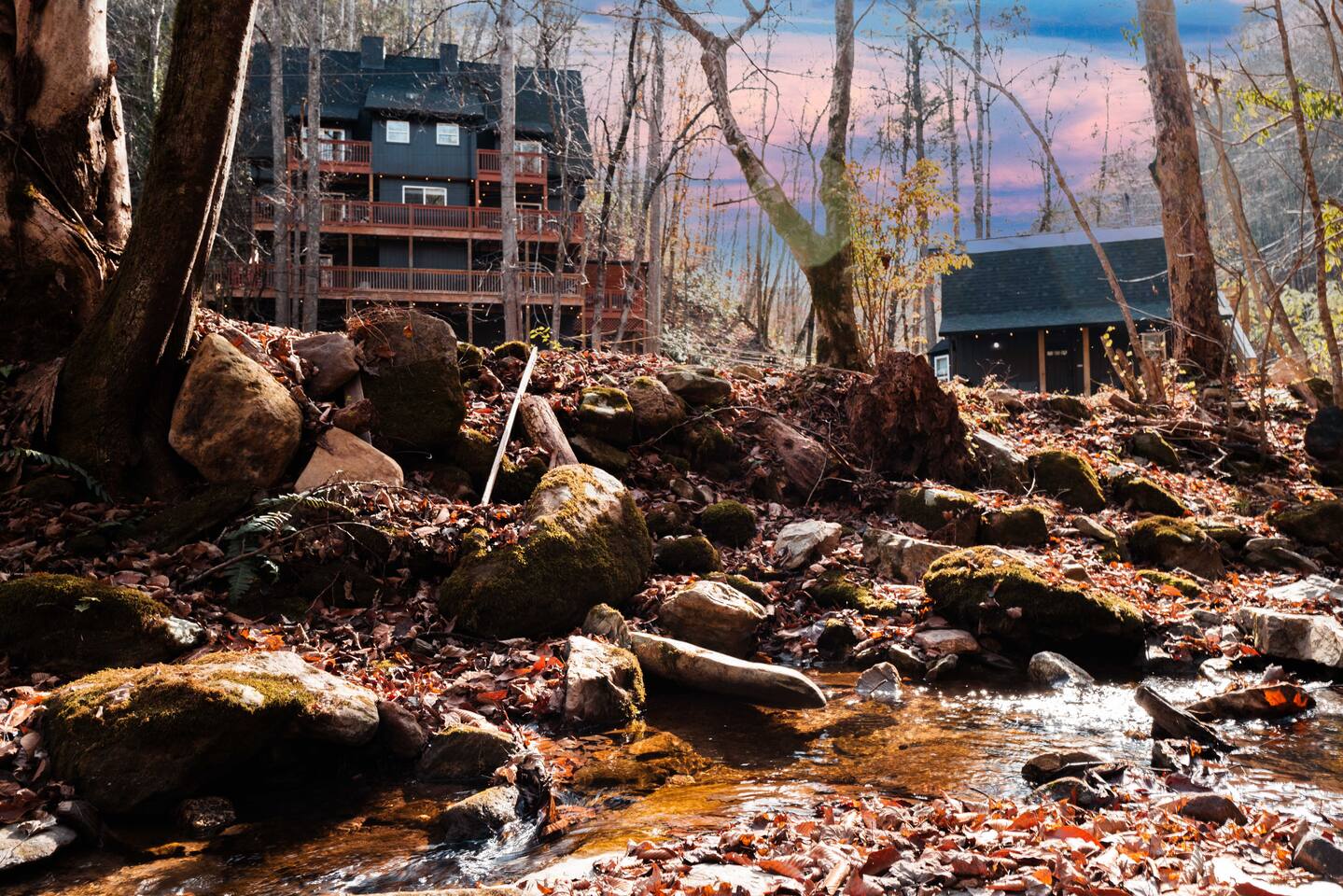 βοΈ Welcome to Stony Creek Escape βοΈ Book now at this breathtaking 6-acre Estate located in the private Shagbark Resort. Centrally located to all of the BEST attractions the Smokies has to offer, the Escape provides the ultimate retreat for your group. 2 properties- The Lodge and The Bungalow sleep a combined 25 guests, feature 2 hot tubs, game room, fire pit, big grassy area, and stunning flowing creek. πΆ Pet Friendly π 23 min to Pigeon Forge ποΈ 30 min to Dollywood β°οΈ 35 min to Gatlinburg