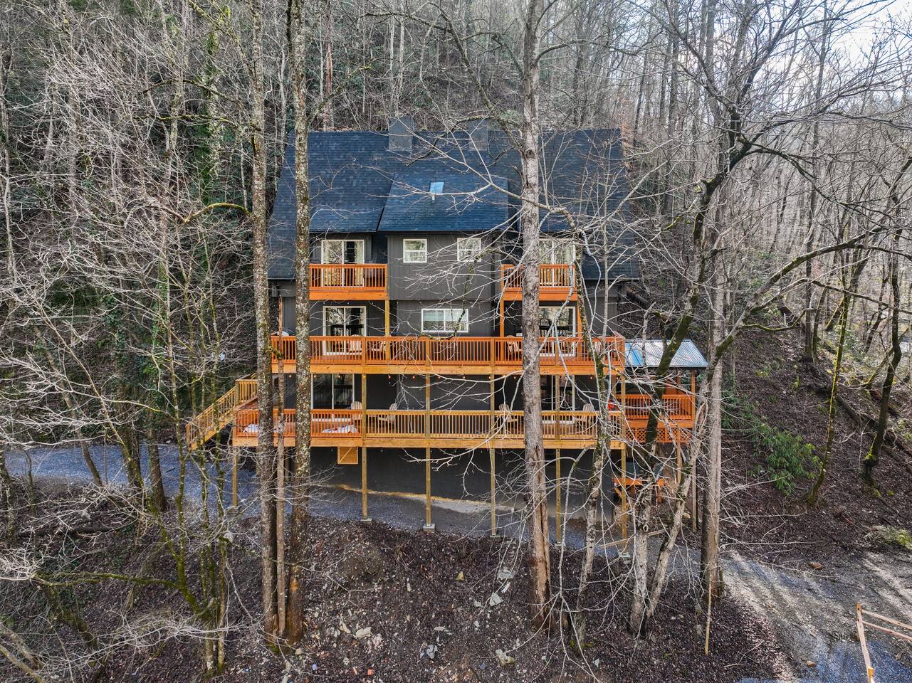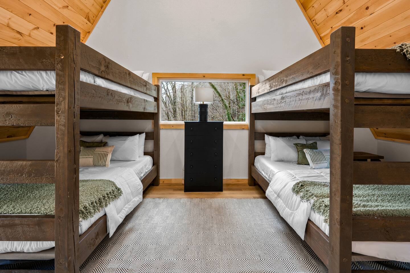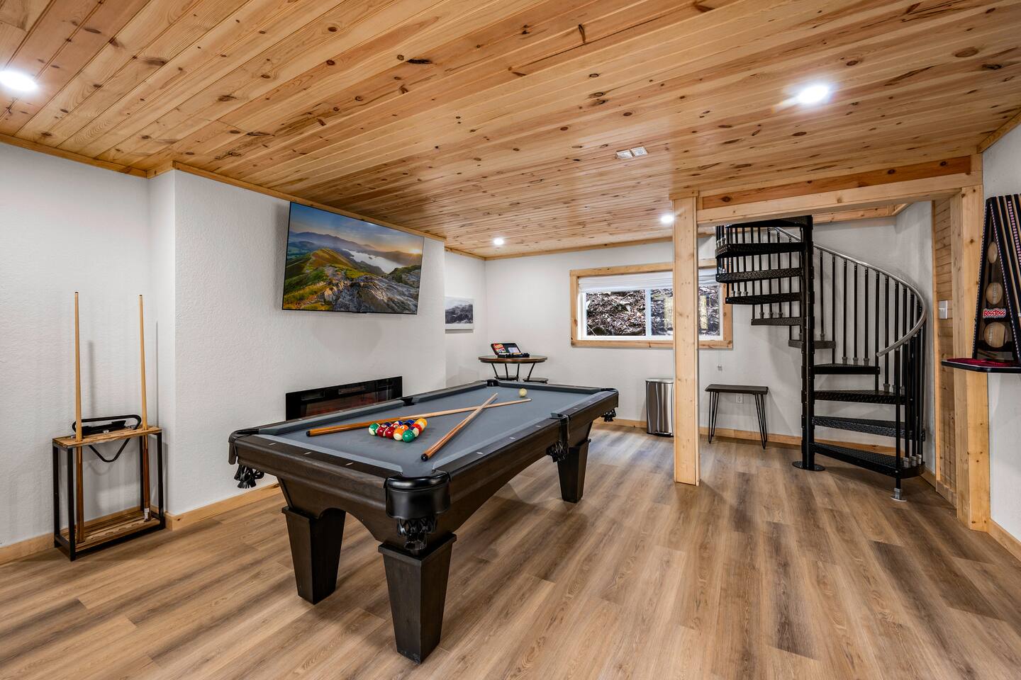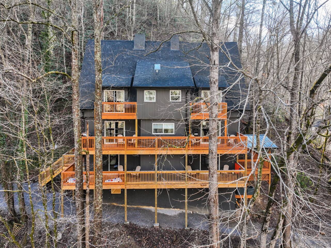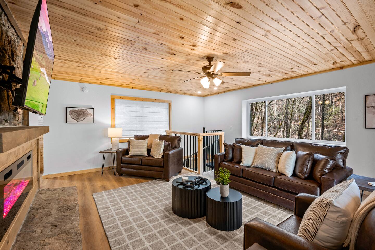 Stony Creek Lodge is a stunning 4-bedroom, 3.5-bathroom home nestled on a picturesque 6-acre estate in the tranquil Shagbark Resort private community. This thoughtfully designed home accommodates up to 17 guests and offers the perfect blend of premium amenities, comfort, and functionality. Pet friendly for up to 2 pets! Book your stay today and enjoy a perfect mountain getaway in Shagbark Resort! π΄ Dining Area & Fully-Stocked Kitchen: Step foot into the large dining area as you first enter the home. Our large, rustic dining table comfortably fits 10, with additional bar-height seating available in the nook and kitchen. Enjoy a home-cooked meal with the entire group, taking in the ambiance provided by the electric fireplace mounted to the wall. A large Roku Smart TV means you'll never miss a big play as you cheer on your favorite team or catch up on some shows. Just beyond the dining area you'll find the fully-stocked kitchen, featuring full-size appliances, cookware, glassware, plates/bowls, utensils, and basic cooking essentials you'll need to cook for the entire group. Enjoy your morning brew using our Keurig drip and K-cup dual coffee pot. We offer a coffee starter-pack to get you going. Bring extra if you are coffee lovers! π₯ Cozy Living Room: Gather around the fireplace in the with your loved ones- playing games, or watching your favorite shows. The Roku Smart TV is set to Guest Mode, so you can stream on your favorite apps throughout your stay and be automatically logged-out on the day you depart. The couch doubles as a pullout sleeper sofa, providing an extra sleeping area for your group. ποΈ Third Floor Bedrooms: Up the stairs from the dining area you'll find 2 bedroom suites, both featuring a full-bathroom with walk-in shower. Each bedroom has its own private balcony, so you can enjoy that morning cup of coffee while taking in the fresh air of the Smoky Mountains. The King suite features high cathedral ceilings and ample space to feel right at home. Enjoy a Roku Smart TV mounted above a sleek, modern electric fireplace to bring cozy mountain vibes right into your bedroom. Down the hall, you'll find our Bunk suite, equipped with 2 Queen-over-Queen bunkbeds to comfortably sleep an additional 8 guests. This room also features high cathedral ceilings and offers plenty of space so that those sharing the room do not feel over-crowded. The bunk room also features a Roku Smart TV and additional electric fireplace. π Third Floor Nook and Kid's Hideout Between the King and Bunk rooms is a peaceful reading nook, with comfortable seating to get lost in a good book before bed. There is also a dedicated work-space in case you need to catch up on work during your stay. Take the ladder up to our "Kid's Hideout", where your little ones can get lost in board games, shoot some hoops, or simply escape for some peace and quiet (may better serve as a "Parent's Hideout" π) ποΈ First Floor Bedrooms: Taking the spiral staircase down from the living room, you'll find 2 additional bedrooms. The first floor King Suite offers the same cozy vibes captured on the third floor. Catch up on some shows on the Roku Smart TV, and enjoy the ambiance of another electric fireplace. Enjoy your own private full-bathroom with walk-in shower. There is private access to the lower level deck, which spans the entire length of the bottom floor, connecting to the game room entry. An additional bunk room is located down the hall from the King suite, and features a Twin-over-Full bunkbed to comfortably sleep 3 additional guests. In this room you'll also find the laundry closet, featuring a full-size washer and dryer, included with your stay. We provide a start of laundry detergent! π± πΉοΈ Game Room + Hot Tub: The game room is the best room in the house and is also located on the first floor. Our game room features a full-size pool table, multi-game Arcade console, Boss Toss, various board games, a large Roku Smart TV, and electric fireplace. This room is guaranteed to keep your group entertained for hours, as there is something for everyone. Enjoy separate access to the front porch, where you'll find life-size Connect 4 and additional outdoor seating. Off of the game room you'll find the side porch, where you can soak in the hot tub under glowing string lights after a long day exploring the Smokies. There is additional outdoor seating, providing the perfect hangout area for catching up with family and friends. πΆ High-Speed Internet + Smart TVs: Stay connected with reliable, high-speed Wi-Fi throughout the home. All 6 Smart TVs are equipped with Roku set in Guest Mode, so you will be automatically logged out of any of your streaming services used on the day you checkout! π² π Outdoor Space: Enjoy a large, flat grassy area at the front of the Lodge, providing the perfect area to play a game of football with the family, or simply allow the kids and dogs to run around and tire themselves out. The Lodge features 2 large decks, spanning the entire length of the home, featuring life-size Connect-4, a propane grill, and ample outdoor seating for ultimate relaxation. There are 2 smaller, private balconies attached to each bedroom on the third floor. β°οΈ Shagbark Resort: During your stay you'll have access to amenities provided by Shagbark Resort. While here, you can enjoy the outdoor community pool (during summer months), tennis courts, pickleball courts, basketball court, dog park, and more!! For large groups, there is a community center available for rent directly through the HOA! ** Please note- we cannot guarantee availability of resort amenities at the time of your stay, as they are operated solely by the resort. Availability is subject to change. β KEY FEATURES β β’ Located in Shagbark Resort, a gated community β’ Pet Friendly!! Up to 2 pets allowed with non-refundable deposit β’ Tastefully designed interior offering a cozy, modern cabin feel β’ 4 bedrooms: 2 King beds, 2 Queen-over-Qu
