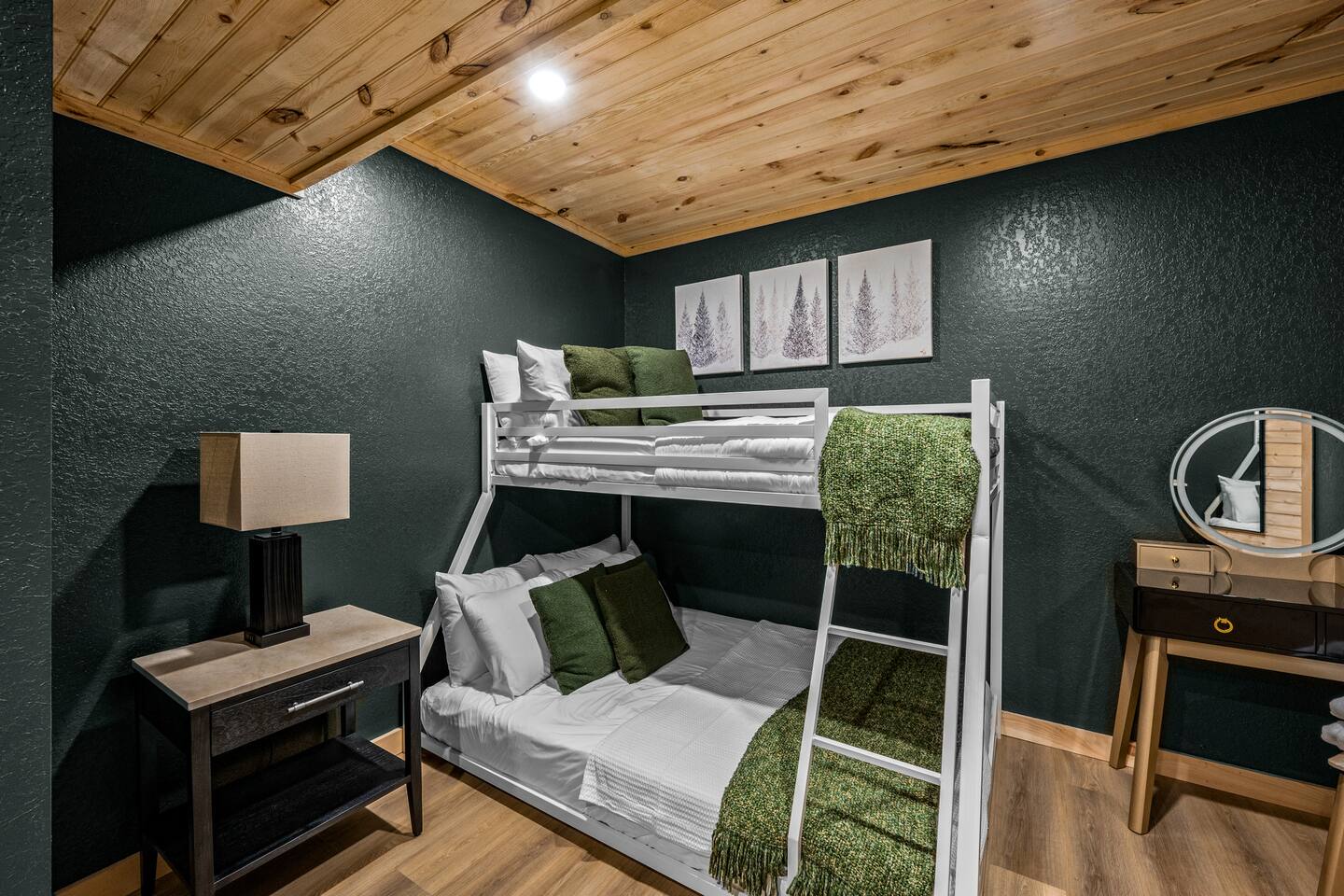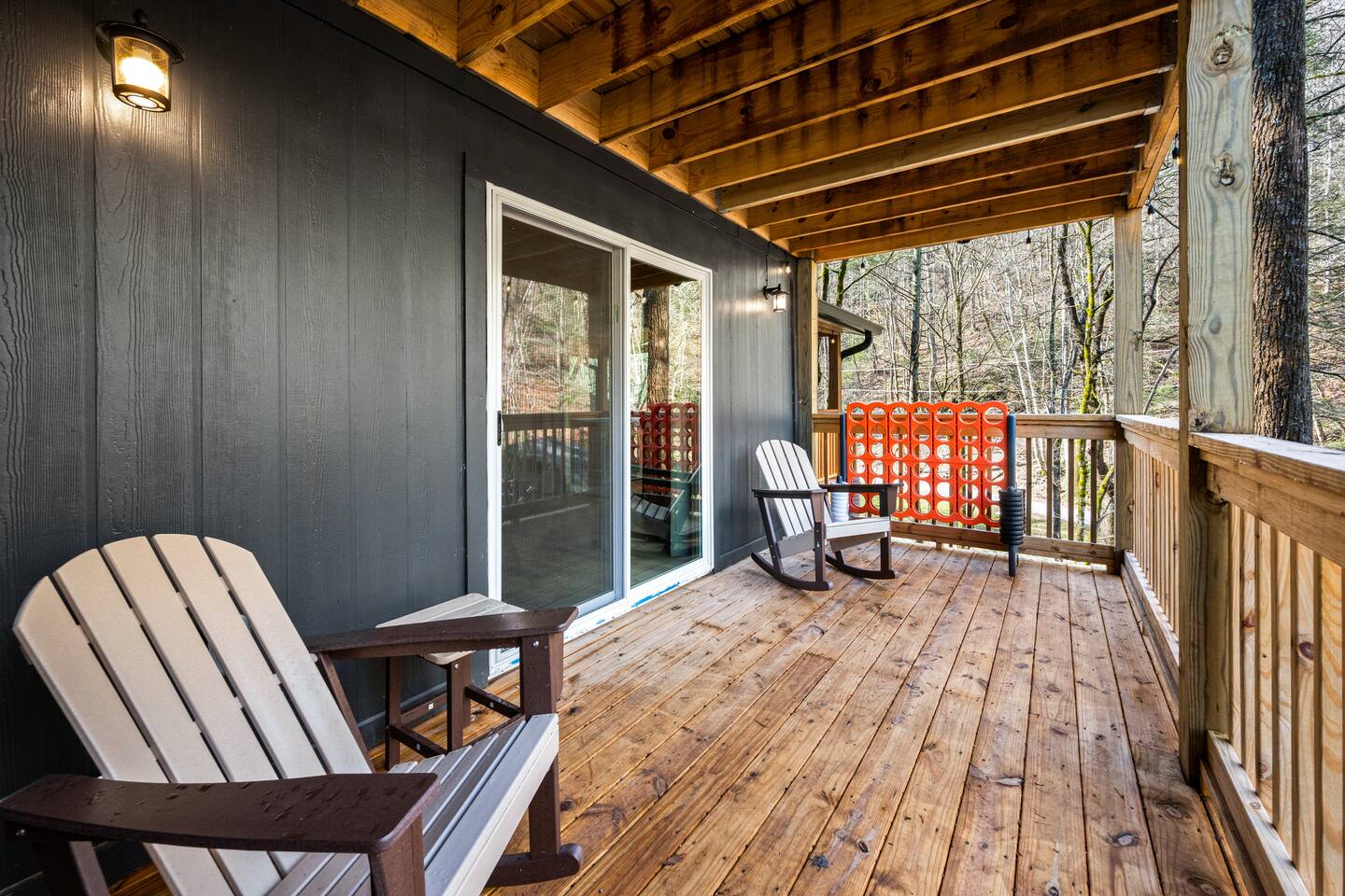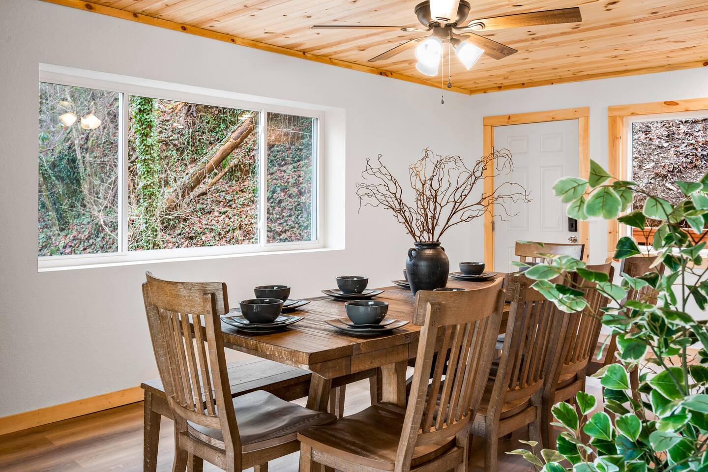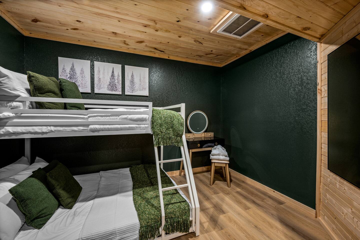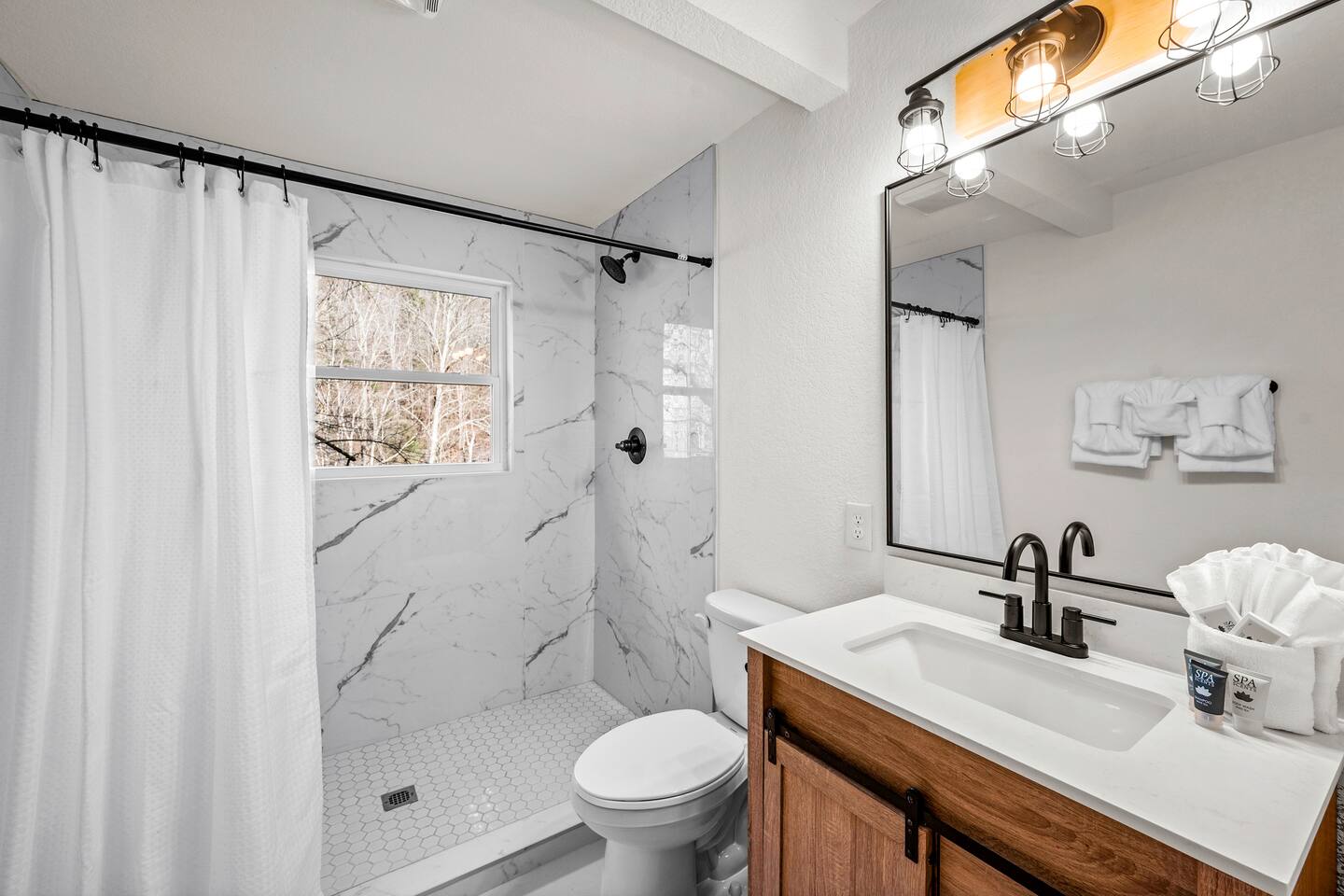 Stony Creek Lodge is a stunning 4-bedroom, 3.5-bathroom home nestled on a picturesque 6-acre estate in the tranquil Shagbark Resort private community. This thoughtfully designed home accommodates up to 17 guests and offers the perfect blend of premium amenities, comfort, and functionality. Pet friendly for up to 2 pets! Book your stay today and enjoy a perfect mountain getaway in Shagbark Resort! π΄ Dining Area & Fully-Stocked Kitchen: Step foot into the large dining area as you first enter the home. Our large, rustic dining table comfortably fits 10, with additional bar-height seating available in the nook and kitchen. Enjoy a home-cooked meal with the entire group, taking in the ambiance provided by the electric fireplace mounted to the wall. A large Roku Smart TV means you'll never miss a big play as you cheer on your favorite team or catch up on some shows. Just beyond the dining area you'll find the fully-stocked kitchen, featuring full-size appliances, cookware, glassware, plates/bowls, utensils, and basic cooking essentials you'll need to cook for the entire group. Enjoy your morning brew using our Keurig drip and K-cup dual coffee pot. We offer a coffee starter-pack to get you going. Bring extra if you are coffee lovers! π₯ Cozy Living Room: Gather around the fireplace in the with your loved ones- playing games, or watching your favorite shows. The Roku Smart TV is set to Guest Mode, so you can stream on your favorite apps throughout your stay and be automatically logged-out on the day you depart. The couch doubles as a pullout sleeper sofa, providing an extra sleeping area for your group. ποΈ Third Floor Bedrooms: Up the stairs from the dining area you'll find 2 bedroom suites, both featuring a full-bathroom with walk-in shower. Each bedroom has its own private balcony, so you can enjoy that morning cup of coffee while taking in the fresh air of the Smoky Mountains. The King suite features high cathedral ceilings and ample space to feel right at home. Enjoy a Roku Smart TV mounted above a sleek, modern electric fireplace to bring cozy mountain vibes right into your bedroom. Down the hall, you'll find our Bunk suite, equipped with 2 Queen-over-Queen bunkbeds to comfortably sleep an additional 8 guests. This room also features high cathedral ceilings and offers plenty of space so that those sharing the room do not feel over-crowded. The bunk room also features a Roku Smart TV and additional electric fireplace. π Third Floor Nook and Kid's Hideout Between the King and Bunk rooms is a peaceful reading nook, with comfortable seating to get lost in a good book before bed. There is also a dedicated work-space in case you need to catch up on work during your stay. Take the ladder up to our "Kid's Hideout", where your little ones can get lost in board games, shoot some hoops, or simply escape for some peace and quiet (may better serve as a "Parent's Hideout" π) ποΈ First Floor Bedrooms: Taking the spiral staircase down from the living room, you'll find 2 additional bedrooms. The first floor King Suite offers the same cozy vibes captured on the third floor. Catch up on some shows on the Roku Smart TV, and enjoy the ambiance of another electric fireplace. Enjoy your own private full-bathroom with walk-in shower. There is private access to the lower level deck, which spans the entire length of the bottom floor, connecting to the game room entry. An additional bunk room is located down the hall from the King suite, and features a Twin-over-Full bunkbed to comfortably sleep 3 additional guests. In this room you'll also find the laundry closet, featuring a full-size washer and dryer, included with your stay. We provide a start of laundry detergent! π± πΉοΈ Game Room + Hot Tub: The game room is the best room in the house and is also located on the first floor. Our game room features a full-size pool table, multi-game Arcade console, Boss Toss, various board games, a large Roku Smart TV, and electric fireplace. This room is guaranteed to keep your group entertained for hours, as there is something for everyone. Enjoy separate access to the front porch, where you'll find life-size Connect 4 and additional outdoor seating. Off of the game room you'll find the side porch, where you can soak in the hot tub under glowing string lights after a long day exploring the Smokies. There is additional outdoor seating, providing the perfect hangout area for catching up with family and friends. πΆ High-Speed Internet + Smart TVs: Stay connected with reliable, high-speed Wi-Fi throughout the home. All 6 Smart TVs are equipped with Roku set in Guest Mode, so you will be automatically logged out of any of your streaming services used on the day you checkout! π² π Outdoor Space: Enjoy a large, flat grassy area at the front of the Lodge, providing the perfect area to play a game of football with the family, or simply allow the kids and dogs to run around and tire themselves out. The Lodge features 2 large decks, spanning the entire length of the home, featuring life-size Connect-4, a propane grill, and ample outdoor seating for ultimate relaxation. There are 2 smaller, private balconies attached to each bedroom on the third floor. β°οΈ Shagbark Resort: During your stay you'll have access to amenities provided by Shagbark Resort. While here, you can enjoy the outdoor community pool (during summer months), tennis courts, pickleball courts, basketball court, dog park, and more!! For large groups, there is a community center available for rent directly through the HOA! ** Please note- we cannot guarantee availability of resort amenities at the time of your stay, as they are operated solely by the resort. Availability is subject to change. β KEY FEATURES β β’ Located in Shagbark Resort, a gated community β’ Pet Friendly!! Up to 2 pets allowed with non-refundable deposit β’ Tastefully designed interior offering a cozy, modern cabin feel β’ 4 bedrooms: 2 King beds, 2 Queen-over-Qu